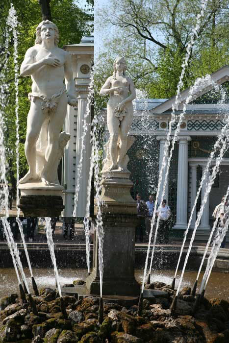 По сторонам Морского канала пересекающиеся аллеи образуют своеобразные площади, от которых расходятся восемь лучей. Эти две большие «звезды» являются важными элементами изначальной планировки Нижнего парка, и поэтому именно здесь находятся старейшие фонтаны Петергофа: «Адам» - в восточной части