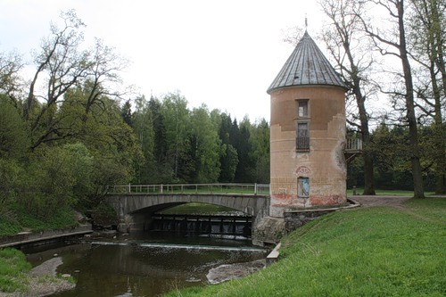 На берегу реки Славянки соорудил «пильную мельницу» в 1797 году В. Бренна, которая представляет цилиндрическую постройку сложенную из кирпича с соломенной крышей и винтовой лестницей.